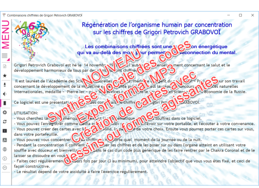 Logiciel ppour WINDOWS et MAC (via Paralles Desktop ou VirtualBox) Ce logiciel est une présentation visuelle et sonore des combinaisons chiffrées de Grigori Petrovich GRABOVOÏ. actuellement il contient 1317 codes numériques NOUVEAU: Création de cartes Formes, NOUVEAU: Synthèse vocale des combinaisons