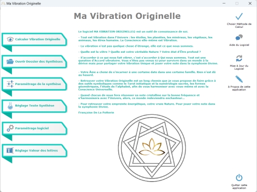 Logiciel pour WINDOWS et MAC (via Paralles Desktop ou VirtualBox) VERSION STANDARD – MA VIBRATION ORIGINELLE est un logiciel basé sur Votre date de naissance, Vos prénoms et NOM auxquels sont appliqués les règles de la numérologie, et l’interprétation selon les cartes du Tarot de Marseille. C’est un outil de coaching, de connaissance de soi et de développement personnel.