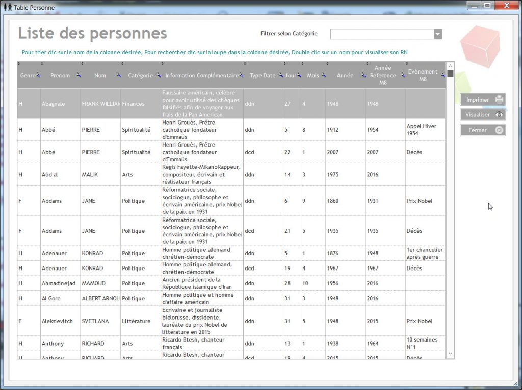 Logiciel en ligne – Adresse du site: www.referentiel-naissance.vitalliances.fr Ce logiciel permet de consulter une Base de données – sur le Référentiel de Naissance. C’est un outil de recherche d’environ 1400 personnalités du monde des : Arts, Aviation, Business, Cinéma, Finances, Informatique, Journaliste, Littérature, Musique, Politique, Royauté, Sciences, Spiritualité, Sports. (base en constante évolution).