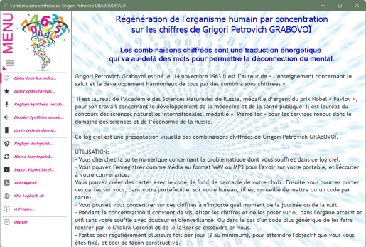 4 octobre 2017 Application Windows – Combinaisons chiffrées de Grigori GRABOVOÏ Complément d’information Que faire pour acquérir la licence vous autorisant… Lire la suite 16 juillet 2017 Applications Androïd – Géomancie Géomancie – Android Lire la suite 2/2