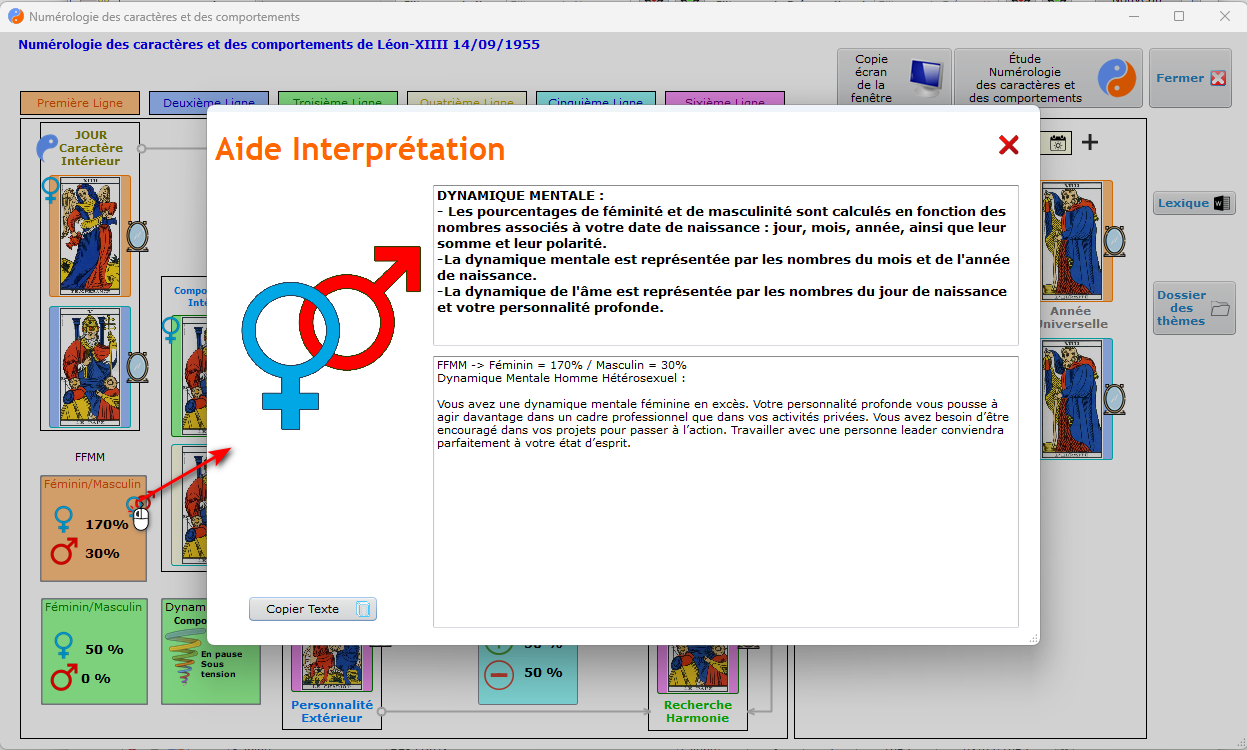 ÉTUDE DU THÈME COMPLET environ 50 pages-> Vous pouvez paramétrer les impressions à votre image + synthèse d’interprétation QUELQUES IMAGES DES CALCULS de DES CARACTÈRES ET DES COMPORTEMENTS PRIX DU LOGICIEL